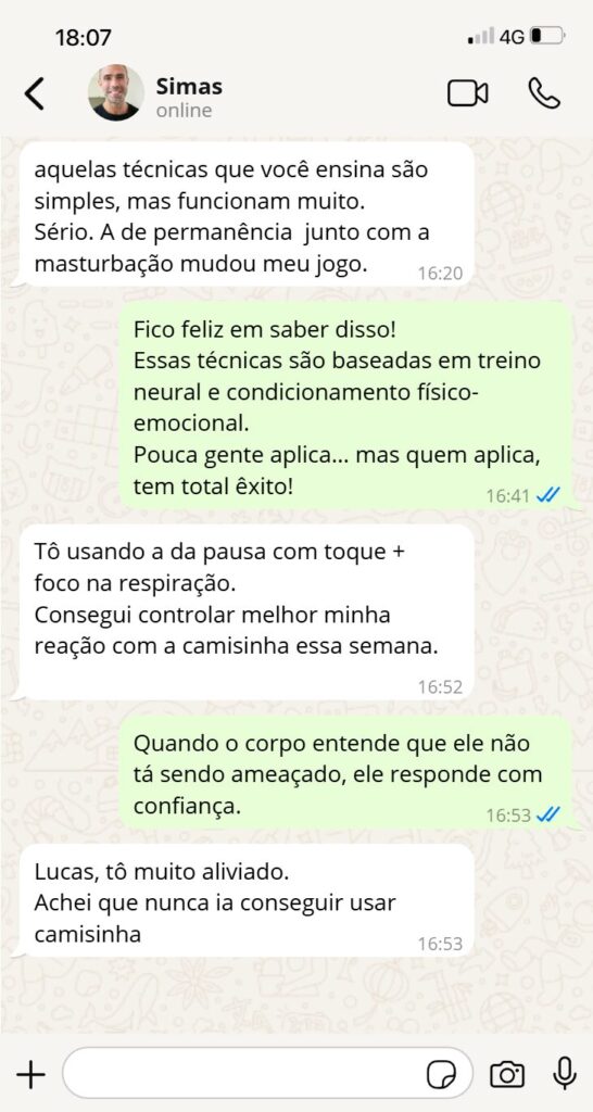 “O que mais me travava era a ansiedade. A hora da camisinha era tipo um teste que já achava que ia falhar. Com os treinos e as técnicas de respiração, consegui mudar esse comportamento. Hoje sou outro cara na cama.”