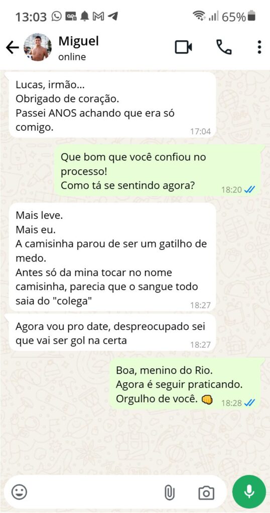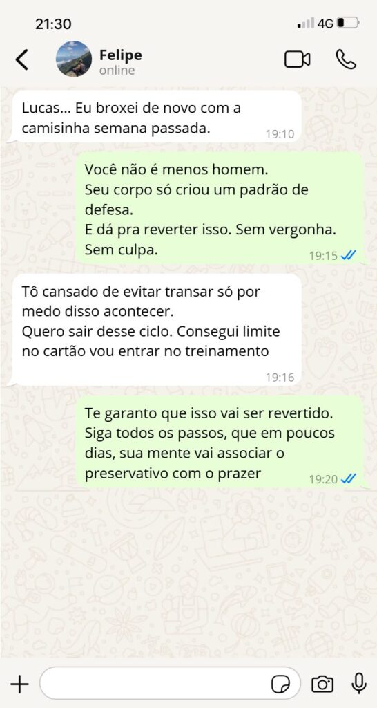 “Eu evitava transar porque só de pensar em usar camisinha, minha ereção sumia. Aprendi a treinar meu corpo e, mais importante, a parar de me julgar. Hoje eu consigo usar camisinha do começo ao fim, com prazer e segurança.”
